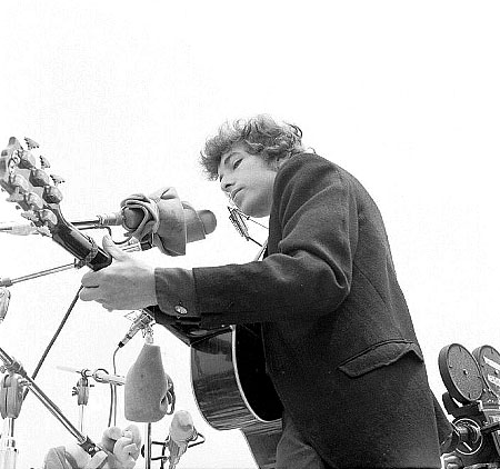 Bob Dylan performing at the Newport Folk Festival, 1965.